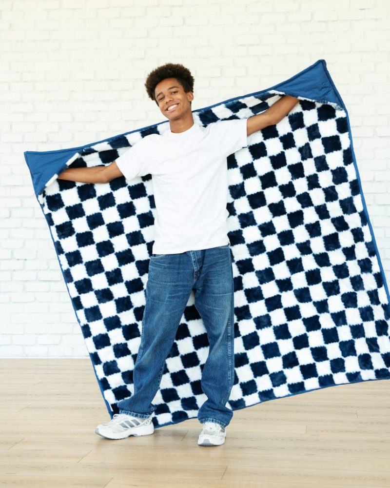 $22.50 – $44.850 out of 5Outdoor blanket perfect for a picnic. watching sports games. camping. the rodeo and more! Outer lining is solid blue with a blue and white checkered plush fabric interior. Dimensions:?Sizing is approximate and based on pre-sewn measurements.? Kids 36×48 (Recommended for kids age 2-7)? Regular 60×63 Details: Water resistant quilted backing Plush minky lining Hood. Folds…