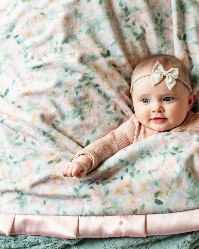 $3.75 – $35.850 out of 5Details:?The Blush Wildflower Blanket showcases a beautiful floral print on a crisp white background. bringing a soft and airy charm to any space. Its plush fabric offers cozy comfort while the delicate design adds a touch of elegance. This blanket is backed in a blush plush minky with a cream?satin ruffle. ? Dimensions: Sizing is…