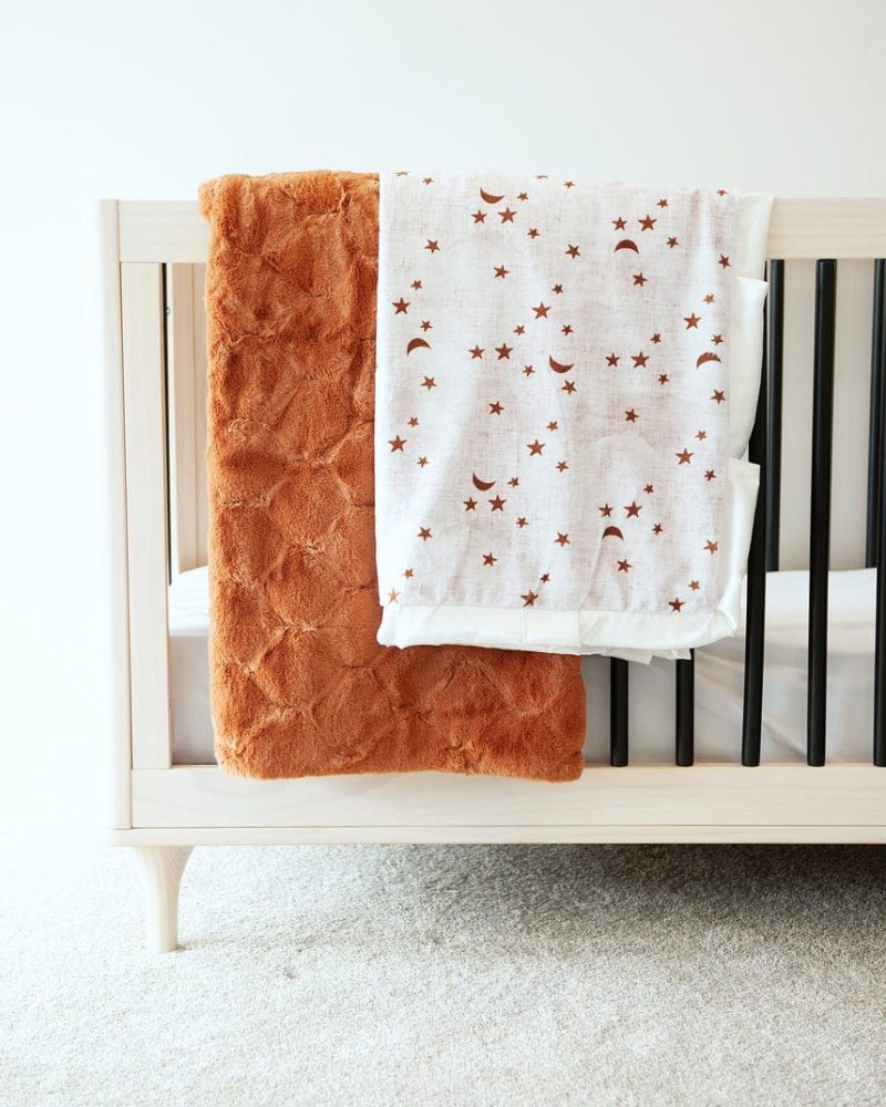 $3.75 – $14.850 out of 5Details:?Gold Stars and Moons. a perfect addition to any nursery. Featuring golden stars and crescent moons on a neutral watercolor background. it’s a gender-neutral gem with a satin ruffle edging. Crafted from plush fabric. it’s a perfect and soft baby gift.?This blanket is backed with a cream?plush minky fabric and bordered in a cream satin…