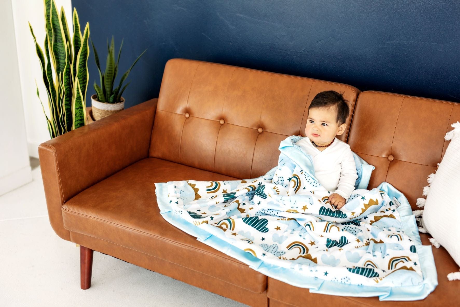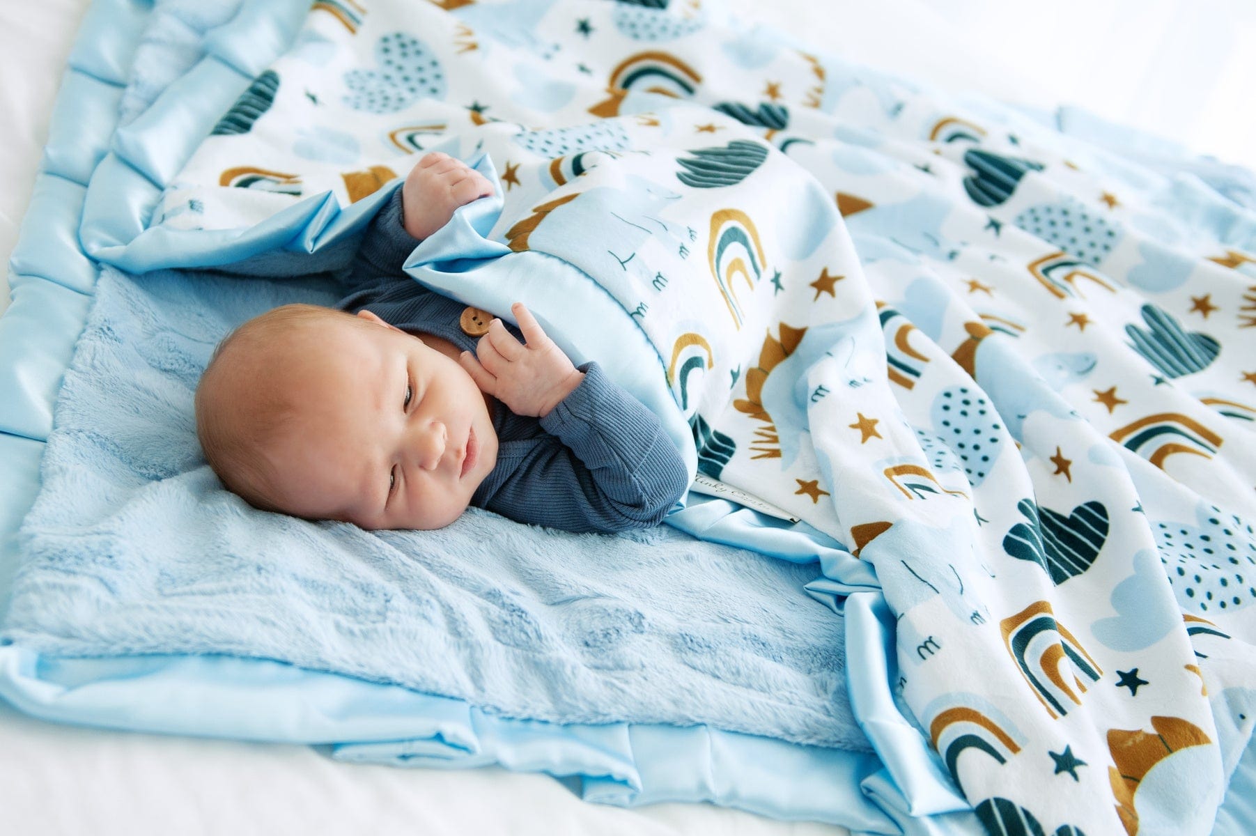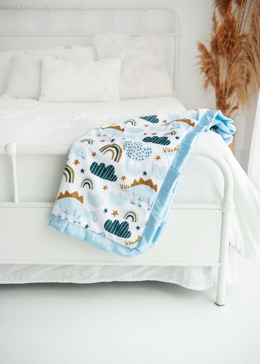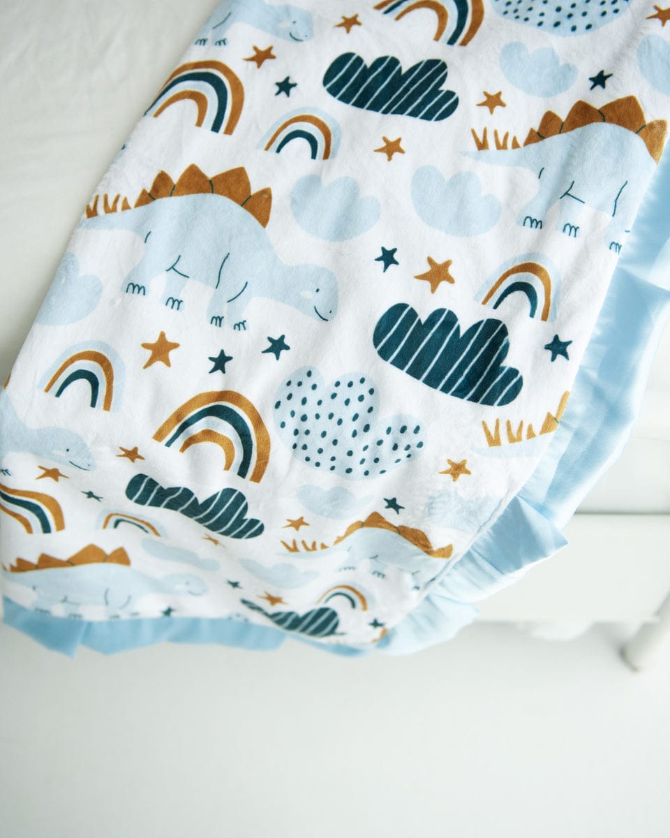 - Details: These cute baby dinosaurs and rainbows aren’t too tough for snuggles!?Baby Dinosaur is?a Minky Couture mid-weight pattern blanket. Mid-weight blankets have shorter minky threads that create a silky feel. This blanket is backed with a light blue plush minky fabric and bordered in a matching blue satin ribbon.