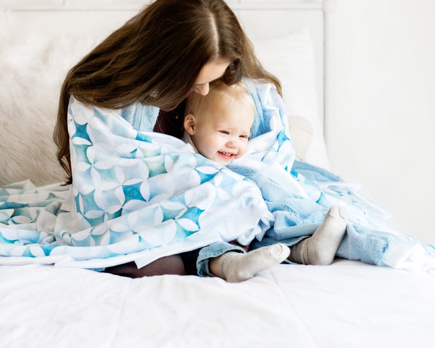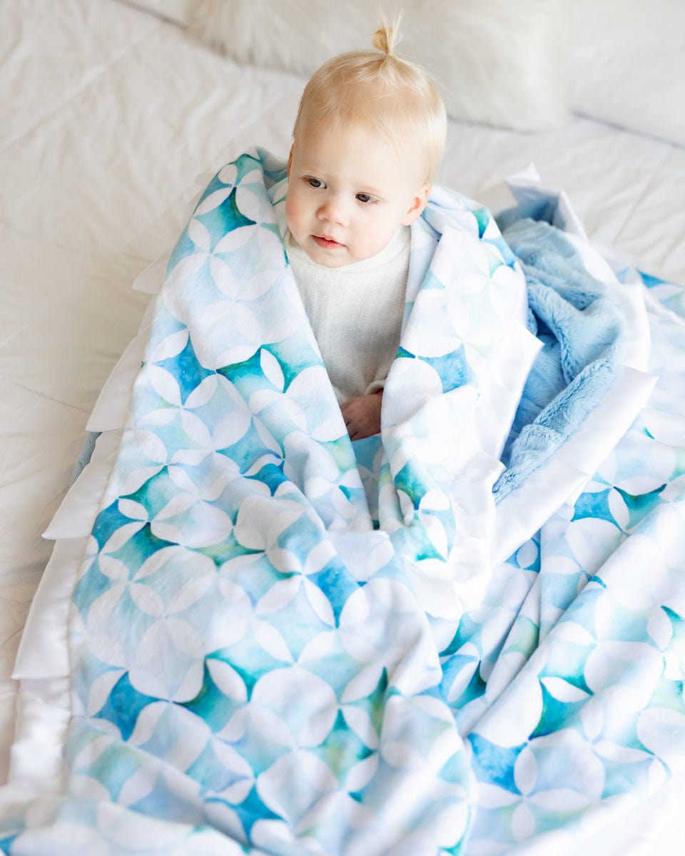 - Details: Embrace the gentle elegance of our Blue Pinwheel Blanket featuring a soothing light blue watercolor design reminiscent of whimsical pinwheels in motion.? Wrap yourself in its tranquil hues. inviting a sense of calm and relaxation into your home.?This blanket is backed in a light blue plush minky and sewn with a white?satin ruffle.