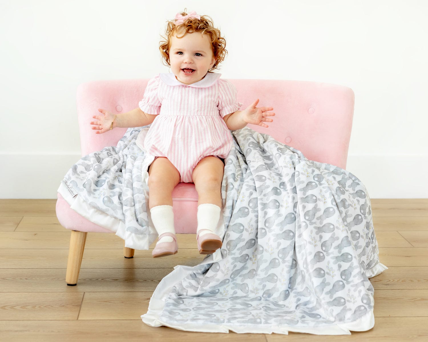 • Details: Introducing our cozy Bunnies Blanket. perfect for adding a touch of charm to your space. This soft gray blanket is adorned with adorable printed bunnies. making it an instant favorite for snuggling up. This blanket?is backed in a gray plush?minky fabric?and sewn with a white satin ribbon.?