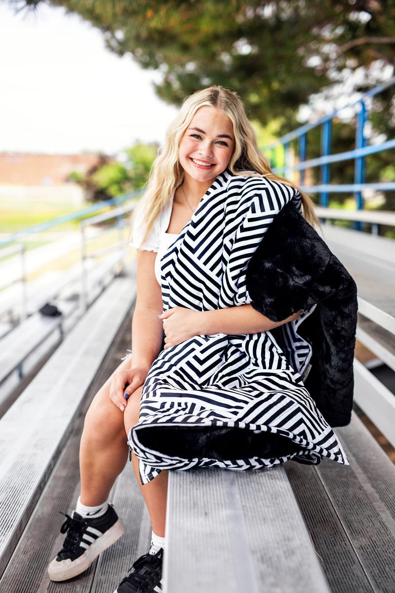 Outdoor blanket perfect for a picnic. watching sports games. camping and more! Outer lining is a geometric black?pattern?with a?solid black?plush fabric interior.