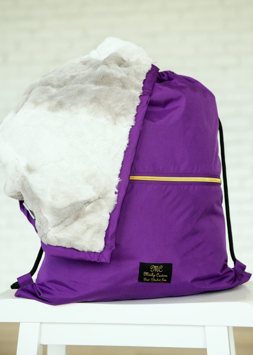 Outdoor blanket perfect for a picnic. watching sports games. camping. the rodeo and more! Outer lining is solid purple with a gray and white variegated plush fabric interior.