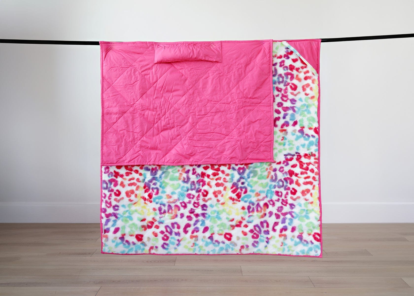 Outdoor blanket perfect for a picnic. watching sports games. camping and more! Outer lining is solid hot pink with a colorful leopard print plush fabric interior.