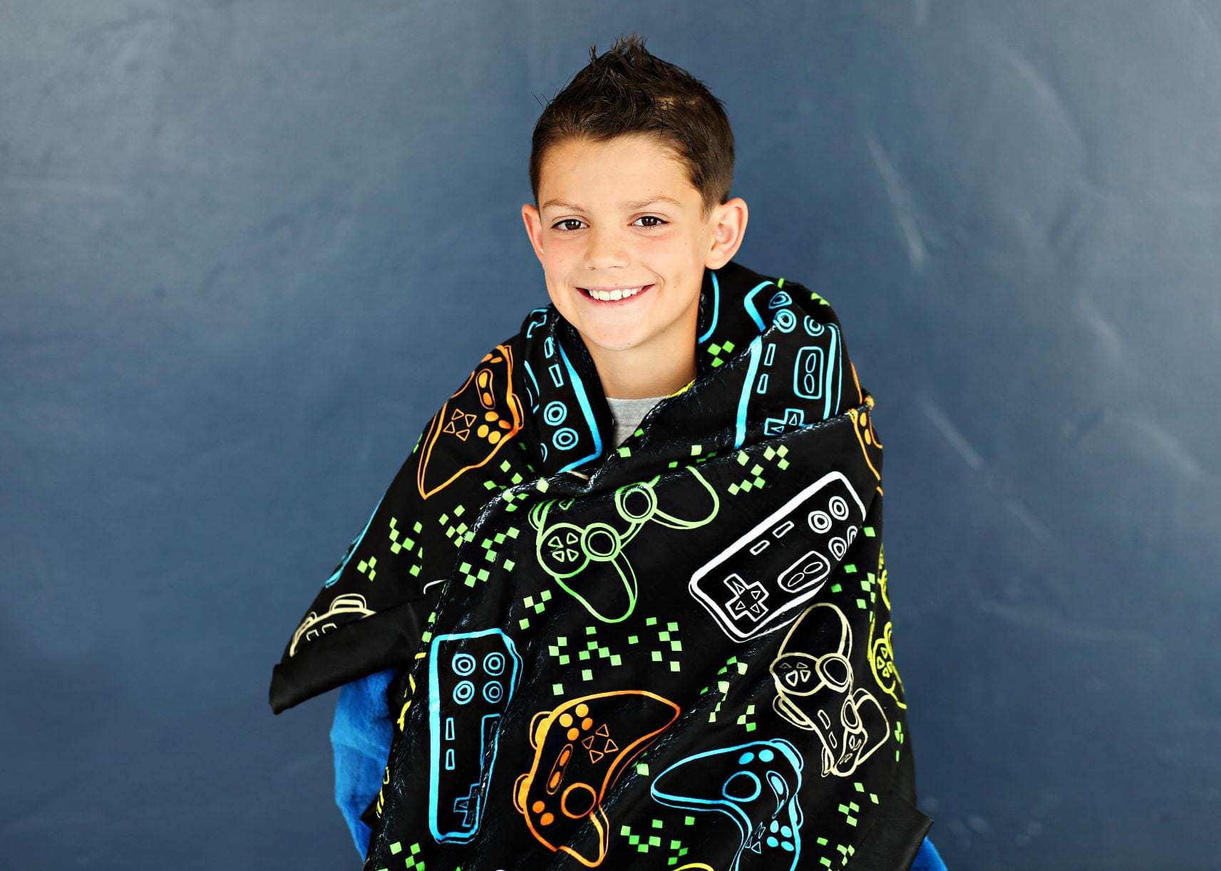 • Details:?You’re sure to get the win as you game in the style and comfort of our new Game Day blanket. This blanket is backed with a?black plush minky fabric and bordered in a matching black satin ribbon.