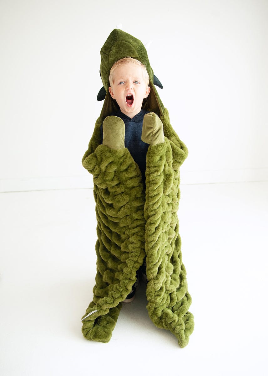 Introducing Huggable Dino. the ultimate companion for little explorers with a love for prehistoric adventures. This green blanket provides a cozy backdrop for imaginative play. The triceratops?dinosaur?head. complete with three majestic horns and a row of green spikes down the back. brings a touch of Jurassic charm to cuddle time. With a generous size of 35×50. this soft and stretchy blanket invites your child to embark on exciting journeys with their newfound dino friend. Watch as they roar into playtime with Huggable Dino by their side!