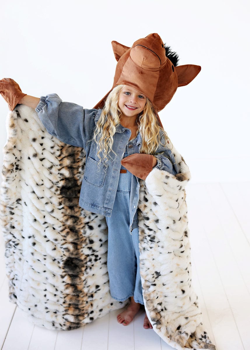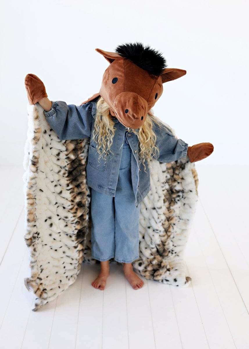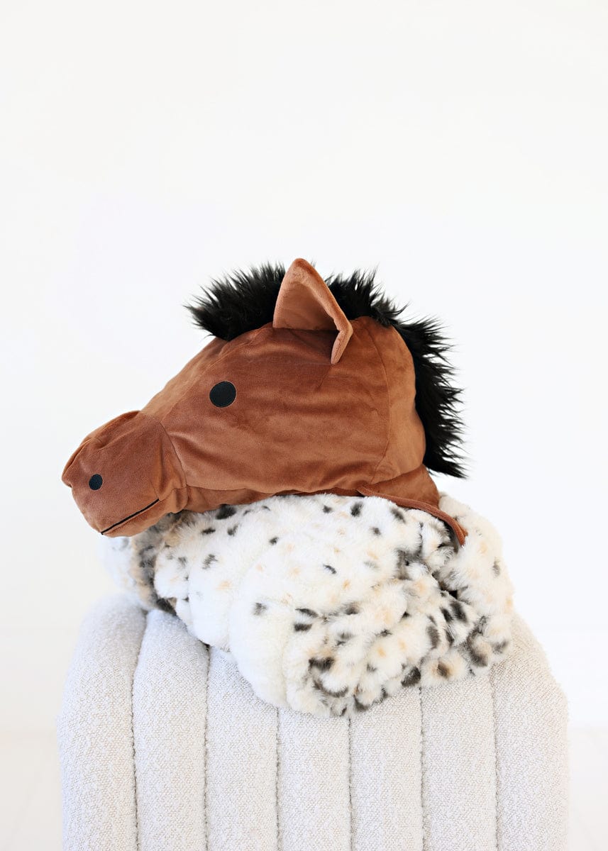 Introducing Huggable Horse. the perfect companion for your little one’s cozy adventures! This delightful blanket features a soft. Appaloosa-inspired design. combining playful spots with a warm brown color. The charming horse head. complete with a gentle expression and flowing mane. adds a whimsical touch to cuddle time. Measuring 35×50. this plush and stretchy blanket creates a cozy space for comfort and imaginative play. Watch as your child gallops into enchanting journeys with their beloved friend. Huggable Horse!