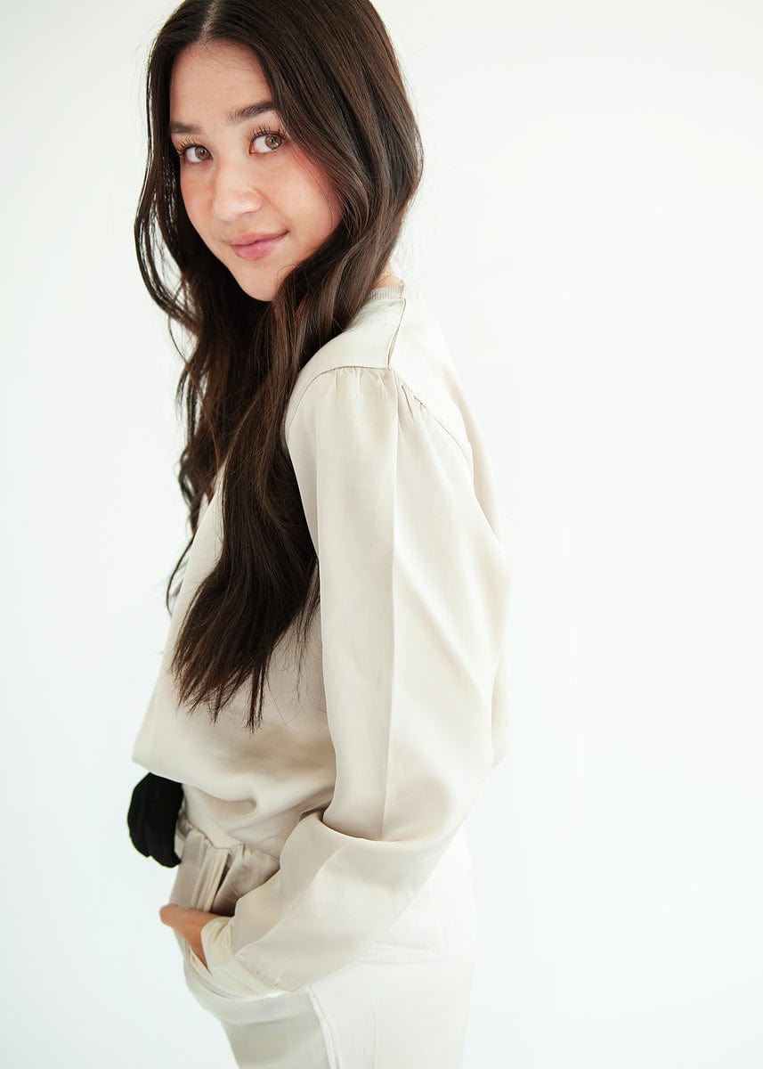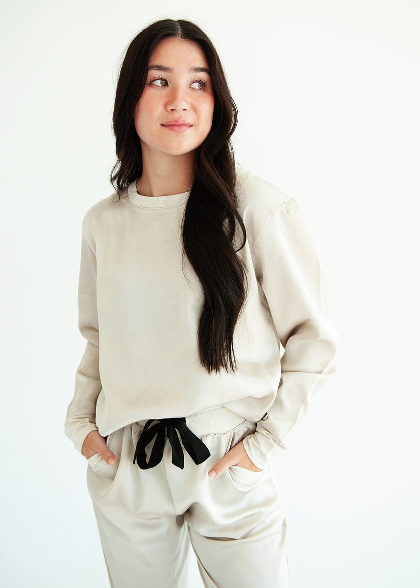 Crafted from 100% high-quality polyester satin. this set features a long sleeve crew neck top with a delicate puff shoulder detail and accent trim at the cuffs. The matching high-waisted jogger pants are effortlessly chic. complete with a comfy drawstring waist. side pockets. and polished cuffed hems for that put-together lounge look.