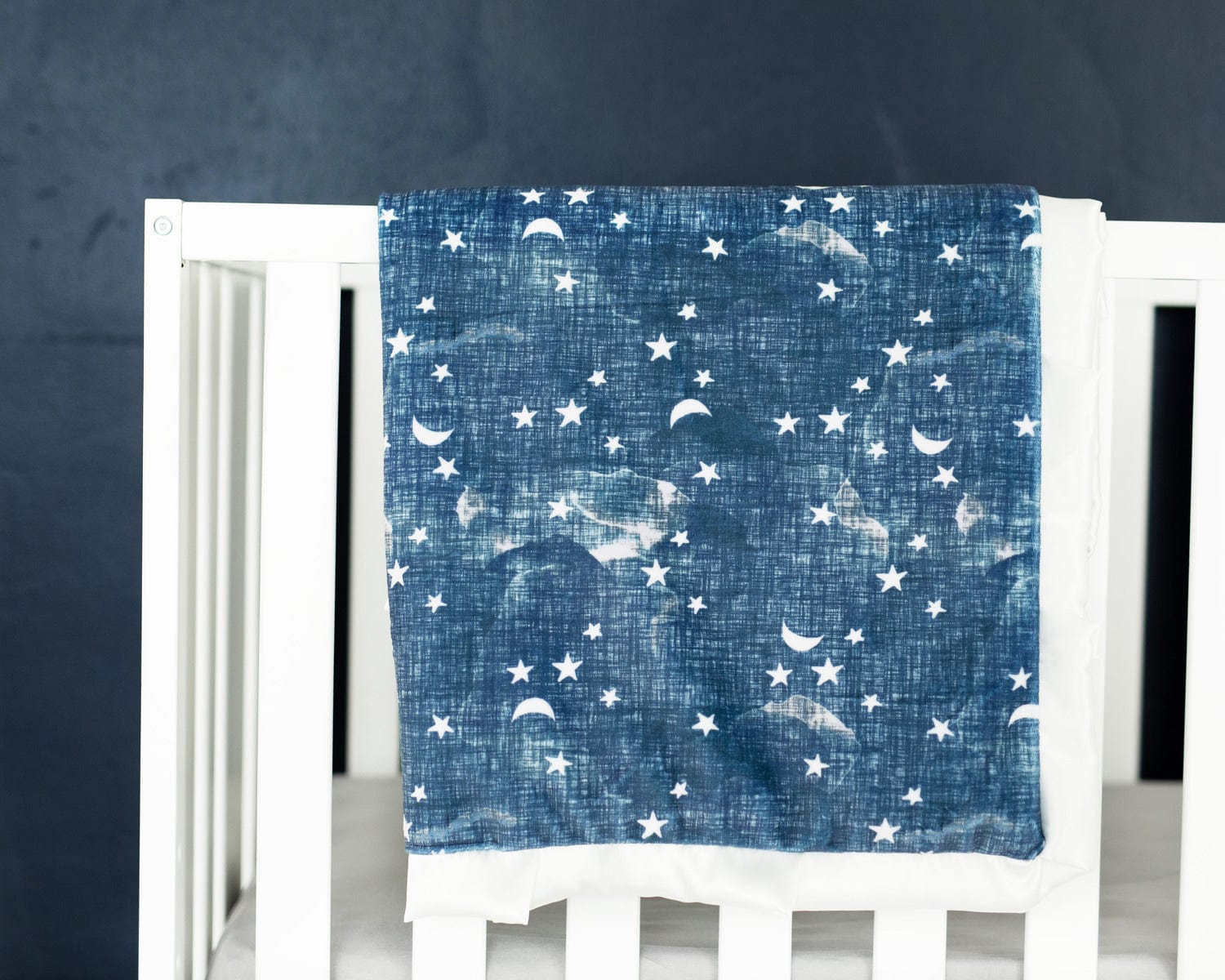 • Details:?Small cream stars and crescent moons nestled on a navy watercolor weaved background.?This blanket is backed with a navy plush minky fabric and bordered in a cream satin ribbon.