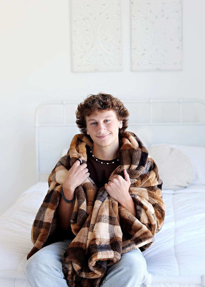 • Details:?Timber Plaid. a timeless emblem of rustic elegance. This blanket showcases a classic plaid pattern in an array of beautiful brown tones. reminiscent of the rugged charm of the great outdoors. Its warm. inviting texture makes it the perfect companion for fireside evenings or chilly mornings.