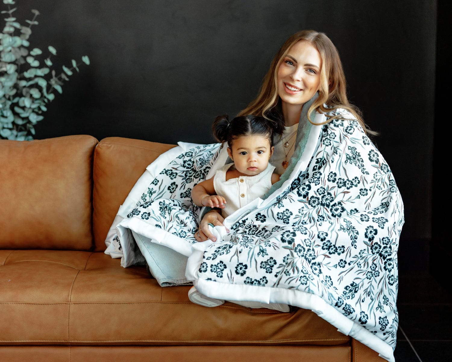 - Details: Embrace the beauty of nature with our wildflower blanket. A white background with dark teal flowers and complimentary greenery that captures the essence of wild. natural beauty. This blanket is backed in a mist green plush minky and sewn with a white satin ruffle.